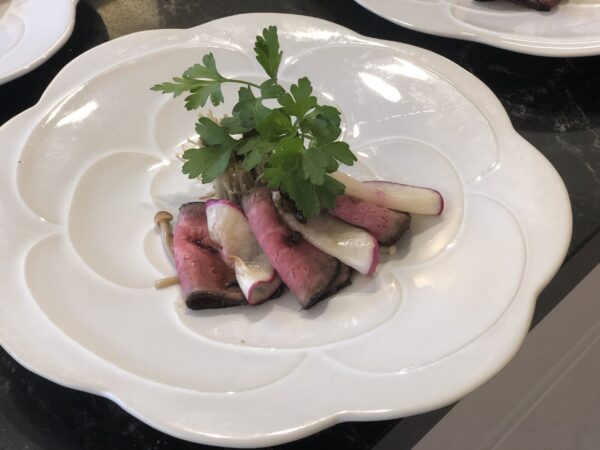 まずはホタテと松の実を使った玄米グラタンをいただいた。Fさんのご飯はいつも体にも舌にも優しく、とてもおいしくいただいた。それからウルイという山菜のおひたしをいただいた。それとマッシュルームのスープ、ローストビーフと大根のサラダ。どれも全部おいしい。