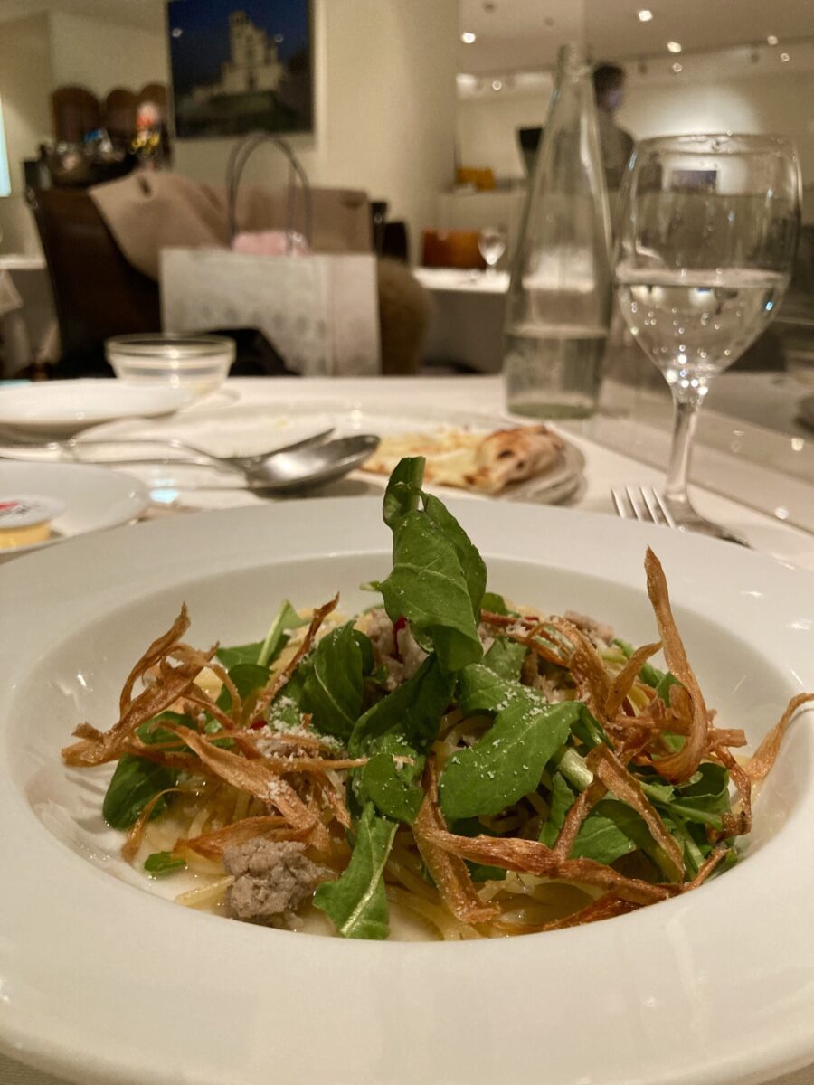 パスタとピザのセットがあったので、2人で頼んでシェアすることにした。パスタはサルシッチャとルッコラと牛蒡のペペロンチーノ、ピザはクワトロフォルマッチにして蜂蜜を一緒に頼んだ。