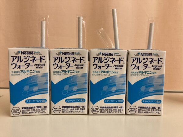 術前にアルジネードウォーターを飲んで、アルギニンをチャージ!これで傷の治りが早くなるかな